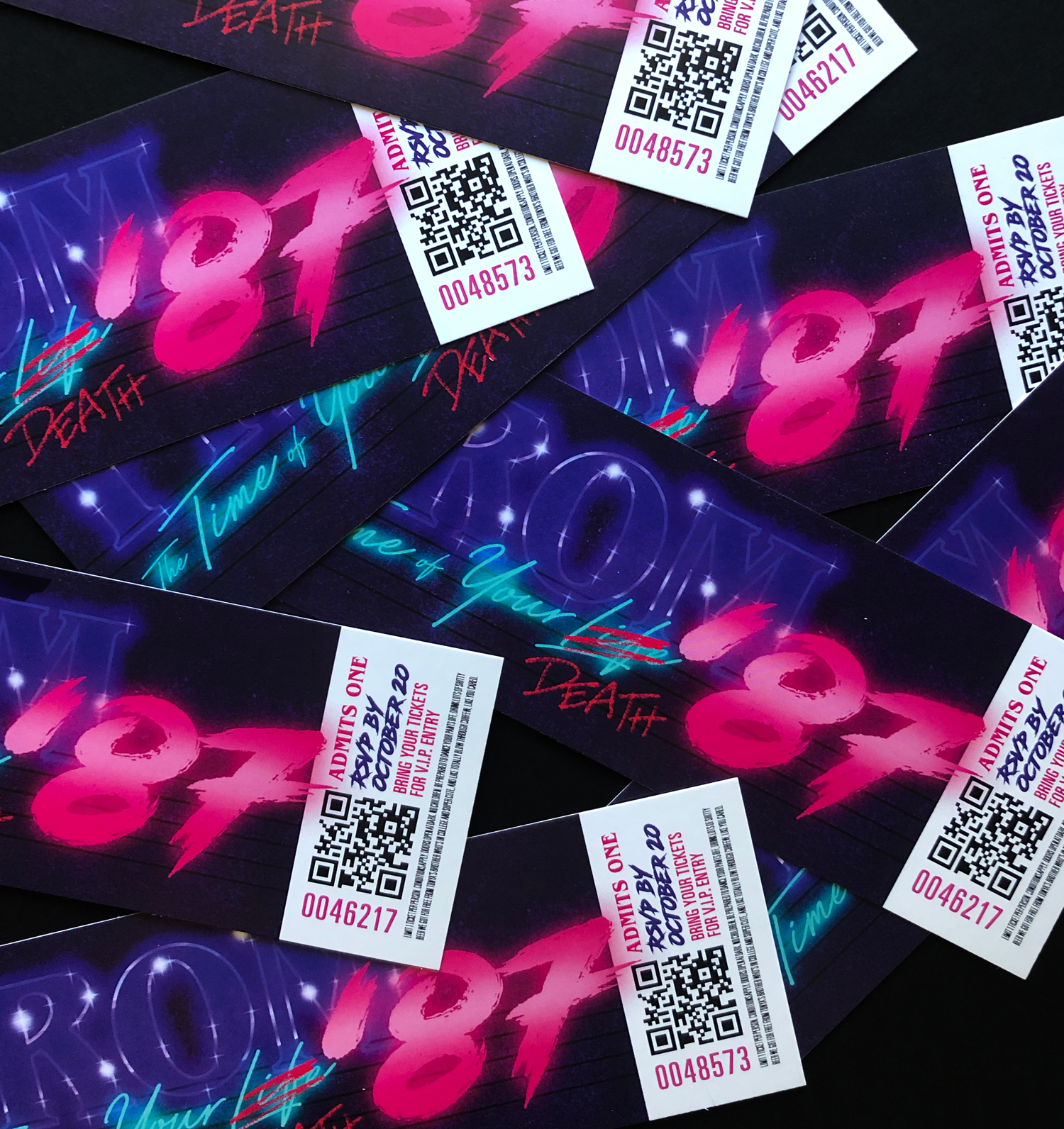 Themed around the 1980’s pulp horror movies. Hand-drawn illustration. Typography is hand-written in fake blood and transferred digitally. Lit balloons floated everywhere, cheese & chocolate fountain, spiked punch, DJ, and custom-arranged photobooth in the back of a stretch limo. Looping cut of 80’s pulp movie snippets.